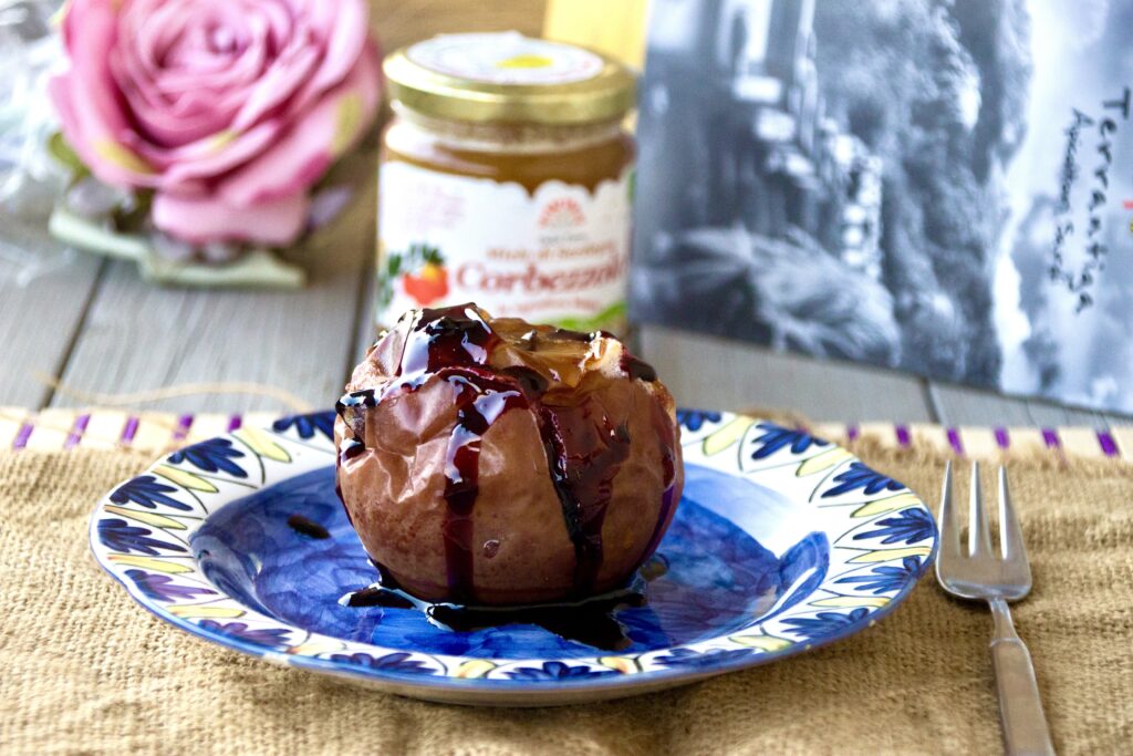 Per questa ricetta Pasquale ha addolcito il gusto della mela annurca con il miele di corbezzolo della O.P. Terrantiga Apicoltori sardi e l’ha servita con una riduzione di vino Casavecchia e miele.